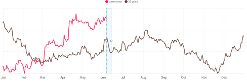 La stagionalità classica evidenzia una correlazione del 73,7%, suggerendo un ribasso nelle prossime sedute che potrebbe protrarsi per circa due settimane.