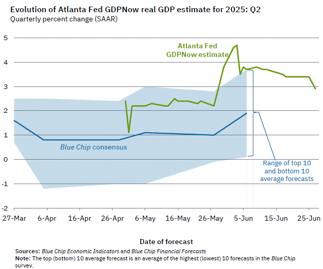 Un altro dato fondamentale è il GDPNow che per il secondo trimestre 2025 è stato rivisto al ribasso al 2,9% il 27 giugno 2025, rispetto al 3,4% del 18 giugno 2025. Questa revisione al ribasso riflette probabilmente l'impatto di dati economici recenti che hanno suggerito una crescita più lenta del previsto, aumentando la pressione sulla Federal Reserve per allentare la politica monetaria attraverso tagli ai tassi.